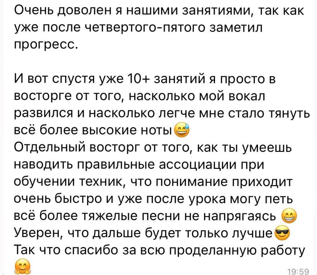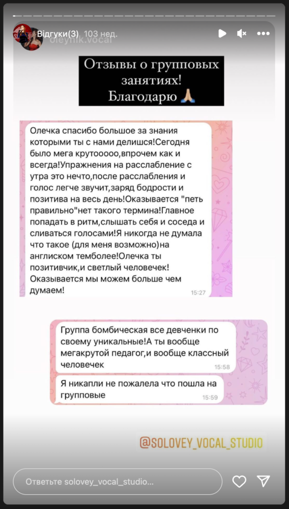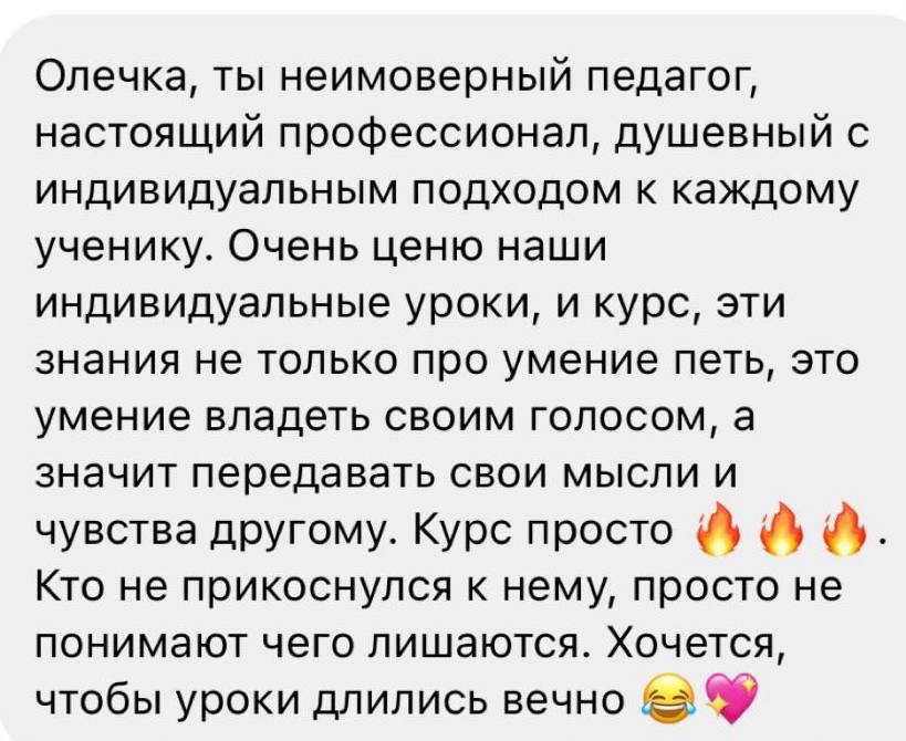 Эта студия — глоток свежего воздуха. Вокал это не просто хобби или увлечение, это как стиль жизни. Ты его выбираешь неосознанно и он окутывает всю твою жизнь. В тот день, когда я переступила порог школы, моя жизнь изменилась к лучшему. Я познакомилась с замечательными и светлыми людьми, с профессионалами и настоящими евангелистами своего дела. Я открыла новые грани своих способностей. Педагоги бережно помогали мне огранить мои навыки. Огромнейшая культура трудолюбия, человеколюбия и творческого культа. Моя любовь к студии Соловей и к педагогам безгранична! Лучшие в своём деле ?